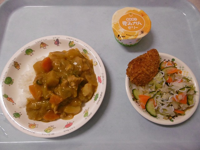 8月18日(金) 給食 ・カレーライス(米・豚肉・じゃがいも・玉ねぎ・にんじん・ピーマン) ・キャベツの甘酢あえ(キャベツ・きゅうり・にんじん・しらす干し) ・夏みかんゼリー