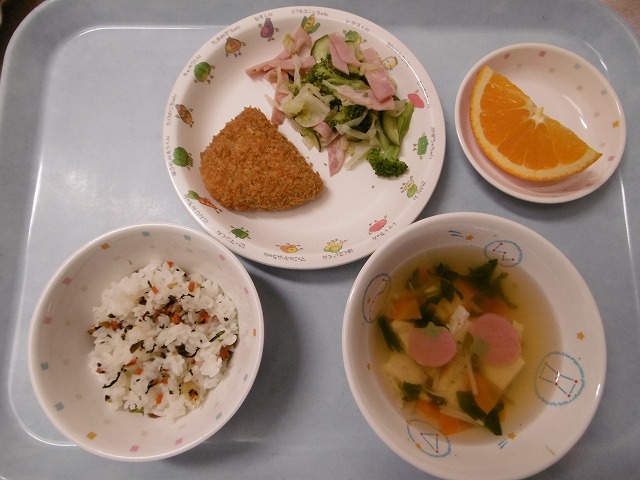 8月21日(月)給食 ・ふりかけごはん ・かぼちゃ挽肉フライ ・グリーンサラダ(キャベツ・きゅうり・ブロッコリー・ハム) ・すまし汁(豆腐・かまぼこ・にんじん・えのきたけ・みつば) ・オレンジ