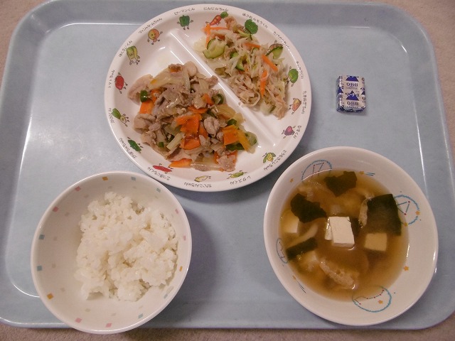 8月22日(火)給食 ・ごはん ・豚肉の生姜焼き(豚肉・玉ねぎ・にんじん・ピーマン) ・切干大根サラダ(切干大根・ツナ・キャベツ・きゅうり・にんじん) ・みそ汁(豆腐・油揚げ・しめじ・ねぎ・わかめ) ・チーズ