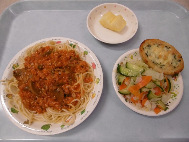 8月24日(木)給食 ・ミートスパゲティ(豚ひき肉・玉ねぎ・にんじん・ピーマン・マッシュルーム・粉チーズ) ・フレンチサラダ(キャベツ・きゅうり・にんじん) ・ポテトカップグラタン ・パイナップル