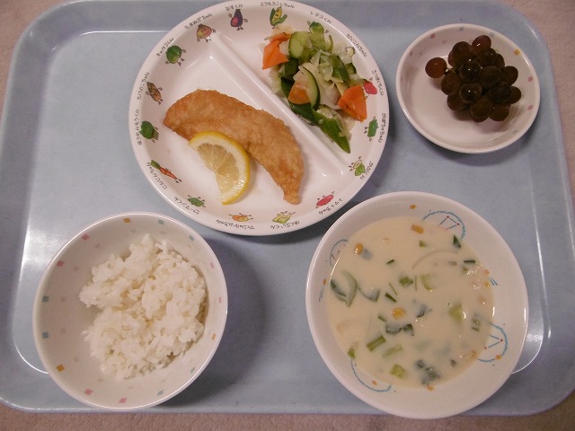 8月25日(金)給食 ・ごはん ・ささみのレモン煮 ・キャベツとおくらの和え物(キャベツ・おくら・きゅうり・にんじん) ・野菜コーンスープ(チンゲン菜・玉ねぎ・えのきたけ・クリームコーン・豆乳) ・ぶどう