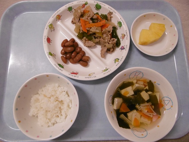 4月21日(金)給食 ・ごはん ・豚肉の生姜焼き(豚肉・玉ねぎ・にんじん・ピーマン) ・金時豆の甘煮 ・すまし汁(豆腐・えのきたけ・にんじん・わかめ) ・パイナップル