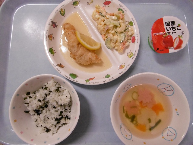 4月26日(水) 給食 ・わかめごはん ・ささみのレモン煮 ・マカロニサラダ(マカロニ・キャベツ・きゅうり・卵・ハム・にんじん・マヨネーズ) ・すまし汁(かまぼこ・ふ・にんじん・ねぎ) ・ゼリー
