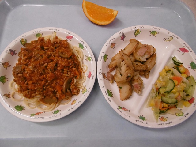 4月28日(金) 給食 ・ミートスパゲティ(スパゲティ・豚挽肉・玉ねぎ・にんじん・ピーマン・マッシュルーム) ・ジャーマンポテト(じゃがいも・ベーコン・玉ねぎ・パセリ) ・フレンチサラダ(キャベツ・きゅうり・にんじん・コーン) ・オレンジ