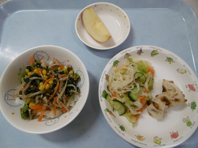 3月13日(月) 給食 ・ビビンバ ・切干大根サラダ ・ちくわの甘煮 ・りんご