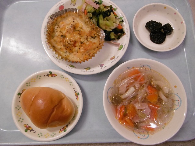 3月14日(火) 給食 ・ロールパン ・マカロニグラタン ・わかめサラダ ・コンソメスープ ・プルーン
