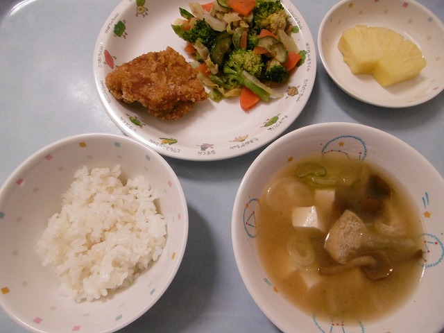 3月24日(金)給食 ・ごはん ・鶏肉の唐揚げ ・ブロッコリーおかかあえ ・なめこのみそ汁 ・パイナップル 一年間、ありがとうございました。