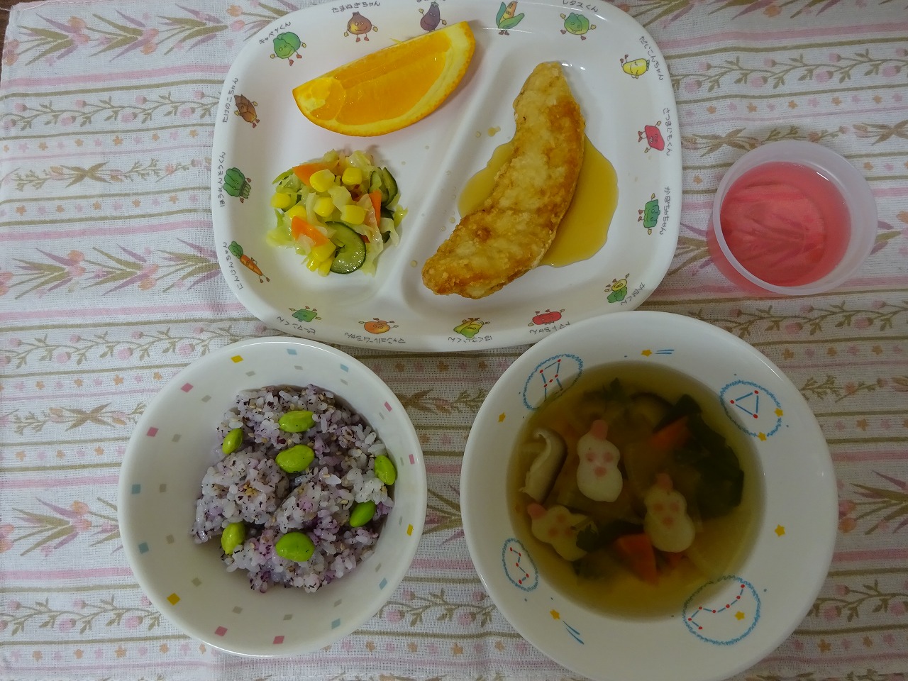1月29日(月)給食:誕生会メニュー ・枝豆ゆかりごはん ・ささみのレモン煮 ・コーンサラダ ・すまし汁 ・オレンジ(※今月の誕生児には手作りゼリーがつきます。)