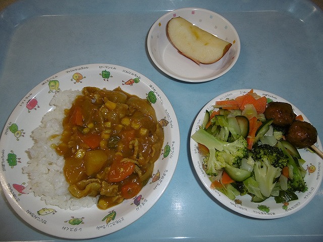 12月5日(月)給食 ・カレーライス ・ブロッコリーサラダ ・つくね串 ・りんご