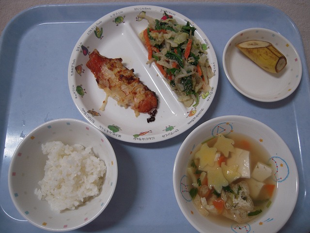 12月20日(火)給食 ・ごはん ・鮭のマヨネーズ焼き ・ほうれん草のごまあえ ・すまし汁 ・バナナ