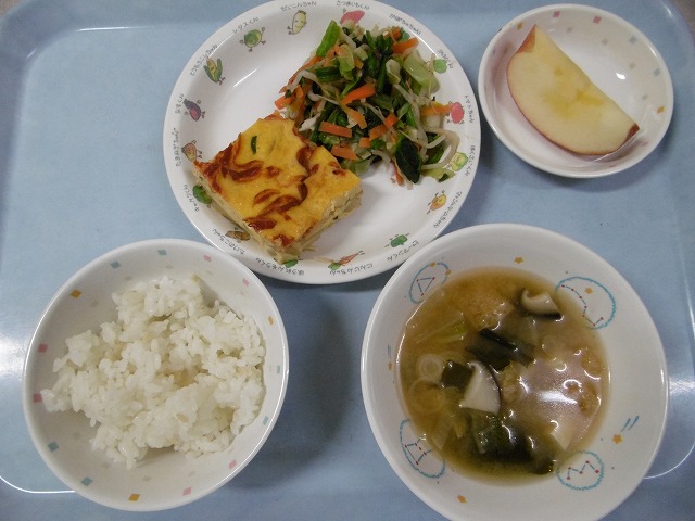 11月15日(水) 給食 ・ごはん ・スペイン風オムレツ ・ほうれん草おひたし ・みそ汁 ・りんご