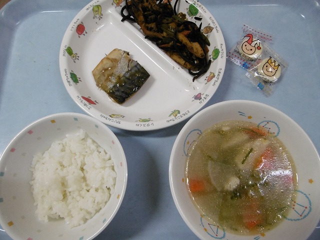 11月16日(水)給食 ・ごはん ・さばのみぞれ煮 ・ひじきの煮物 ・けんちん汁 ・チーズ