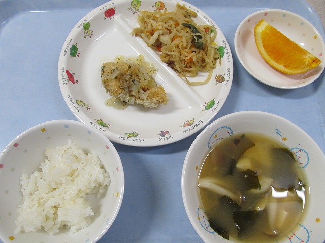 11月25日(金)給食 ・しょうゆラーメン ・鹿の子えび団子揚げ ・いろどりソテー ・みかん