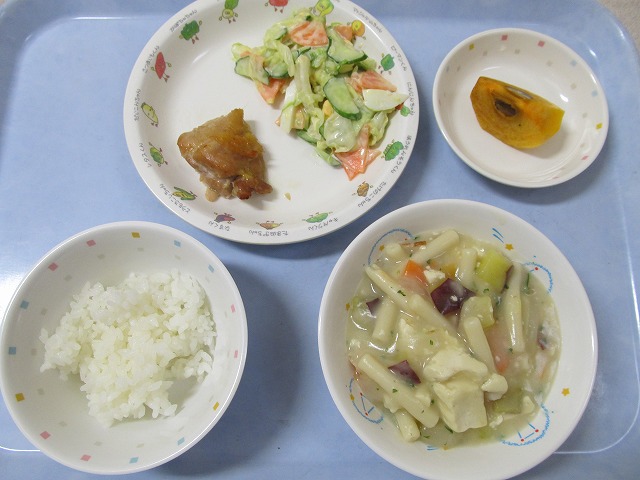 11月25日(金)給食 ・ごはん ・鶏肉のカレー焼き ・キャベツサラダ ・豆腐のクリーム煮 ・かき
