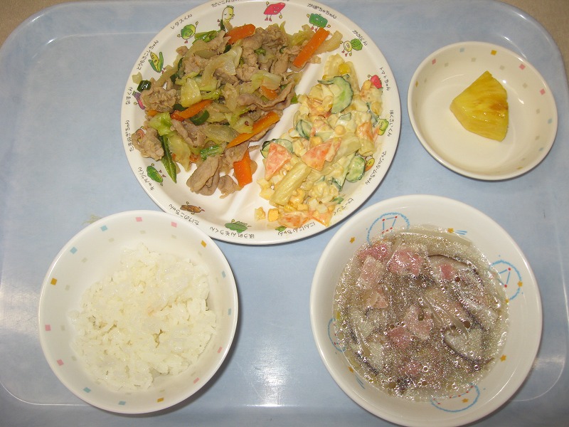 6月1日(水) 給食 ・ごはん ・豚肉のみそ炒め ・マカロニサラダ ・もやしスープ ・パイナップル