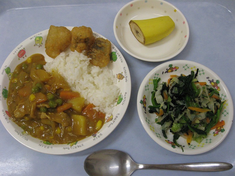 6月6日(月) 給食 ・カレーライス ・白身魚フリッター ・ほうれん草のいそべあえ ・バナナ