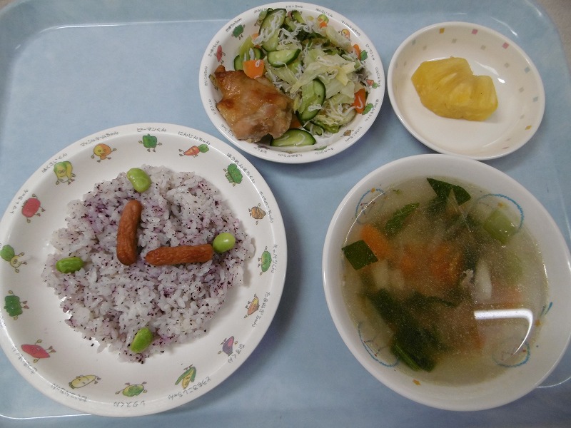 6月10日(金) 給食 ・とけいごはん ・鶏肉の香味焼き ・キャベツの甘酢あえ ・コンソメスープ ・パイナップル