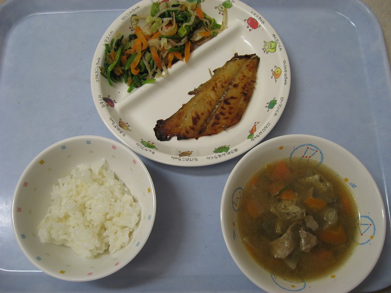 5月18日(水) 給食 ・ごはん ・さわらの照り焼き ・ほうれん草のおひたし ・豚汁 ・プルーン