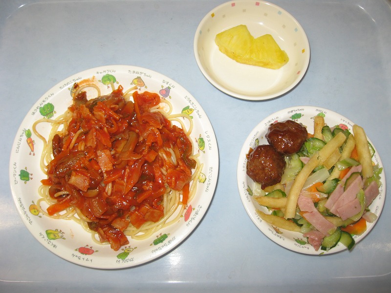5月19日(木) 給食 ・ナポリタンスパゲティ ・ミートボールの甘煮 ・しょうゆフレンチ ・パイナップル