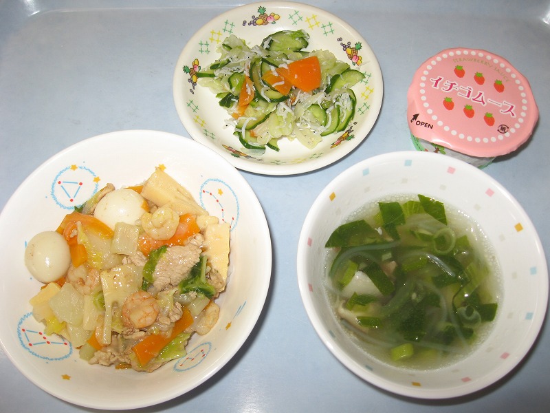 5月23日(月) 給食 ・中華どんぶり ・きゅうりの酢の物 ・春雨スープ ・いちごムース