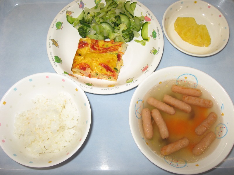 5月26日(木) 給食 ・ごはん ・野菜入りオムレツ ・グリーンサラダ ・コンソメスープ ・パイナップル
