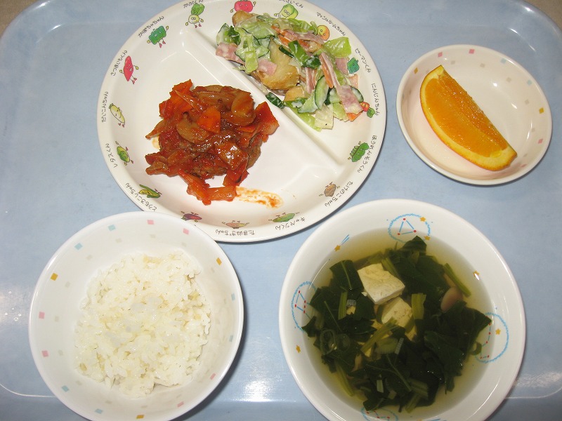 5月30日(月) 給食 ・ごはん ・煮込みハンバーグ ・シーザーサラダ ・すまし汁 ・オレンジ
