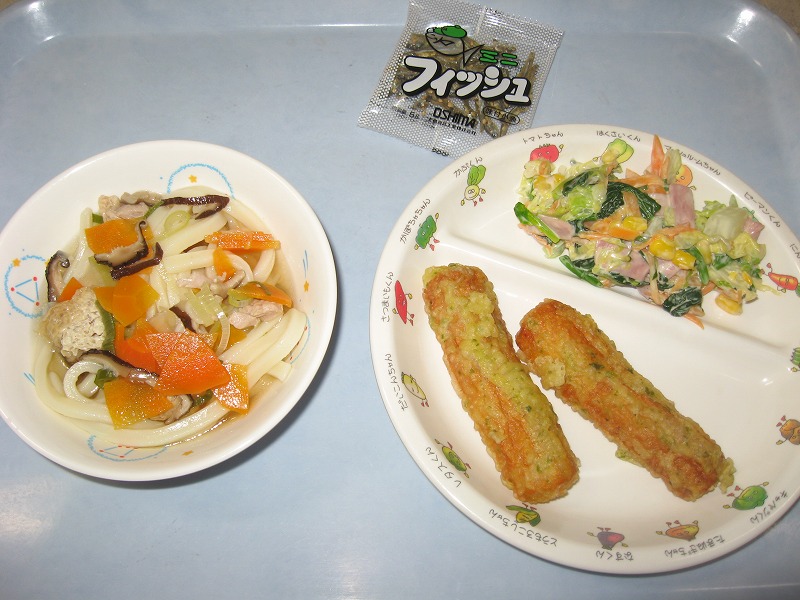 4月21日(木) 給食 ・煮込みうどん ・ちくわの磯辺揚げ ・ほうれん草とハムのサラダ ・ミニフィッシュ