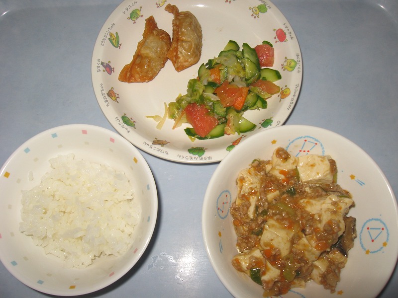 5月2日(月) 給食 ・ごはん ・マーボー豆腐 ・中華あえ ・揚げギョウザ ・バナナ