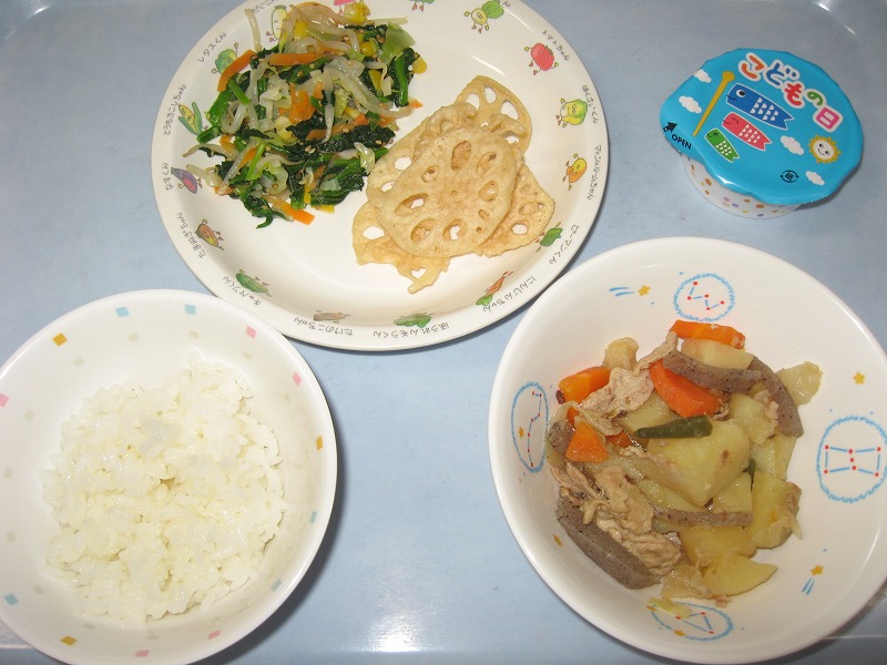 5月6日(金) 給食 ・ごはん ・肉じゃが ・ほうれん草ナムル ・れんこんチップス ・こどもの日ゼリー(メロンゼリー)