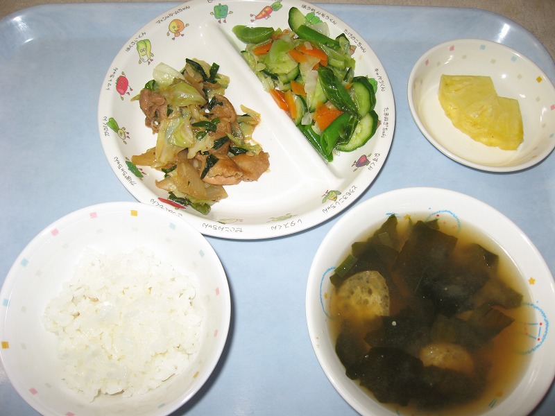 5月11日(水) 給食 ・ごはん ・鶏ちゃん焼き ・えんどうサラダ ・みそ汁 ・パイナップル