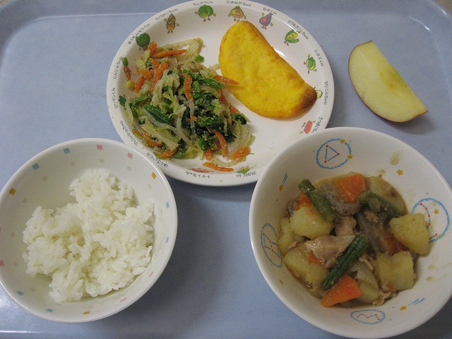3月22日(火) 給食 ・ごはん ・肉じゃが ・ほうれん草のごまあえ ・ミニオムレツ ・りんご