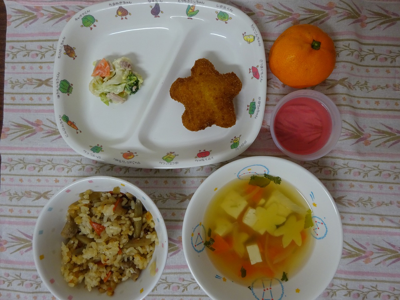 12月26日(火)給食:誕生会メニュー ・鶏ごぼうごはん ・星のコロッケ ・カリフラワーサラダ ・すまし汁 ・みかん(※今月の誕生児のみ手作りゼリーつきます。)