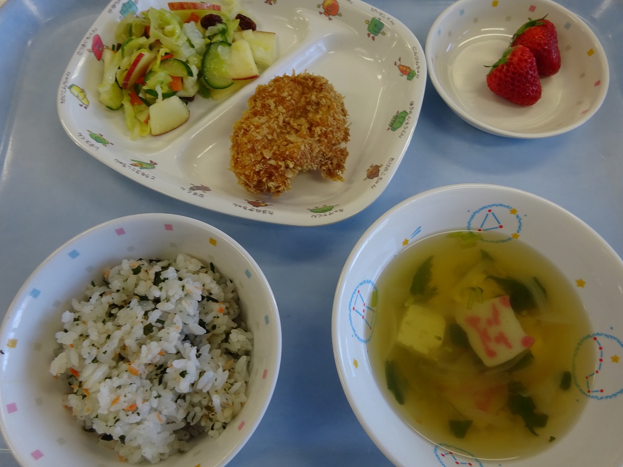 2月22日(水)給食 ・わかめごはん ・チキンカツ(鶏肉・小麦粉・卵・パン粉) ・白菜とりんごのサラダ(白菜・りんご・キャベツ・きゅうり・にんじん・レーズン) ・すまし汁(豆腐・かまぼこ・えのきたけ・玉ねぎ・みつば) ・いちご