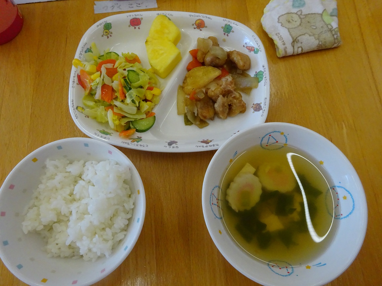 2月28日(火)給食 ・ごはん ・鶏肉と野菜の甘酢煮(鶏肉・ポテト・にんじん・玉ねぎ・ピーマン) ・コーンサラダ(コーン・キャベツ・きゅうり・にんじん) ・すまし汁(豆腐・なると・こまつな・しめじ) ・パイナップル