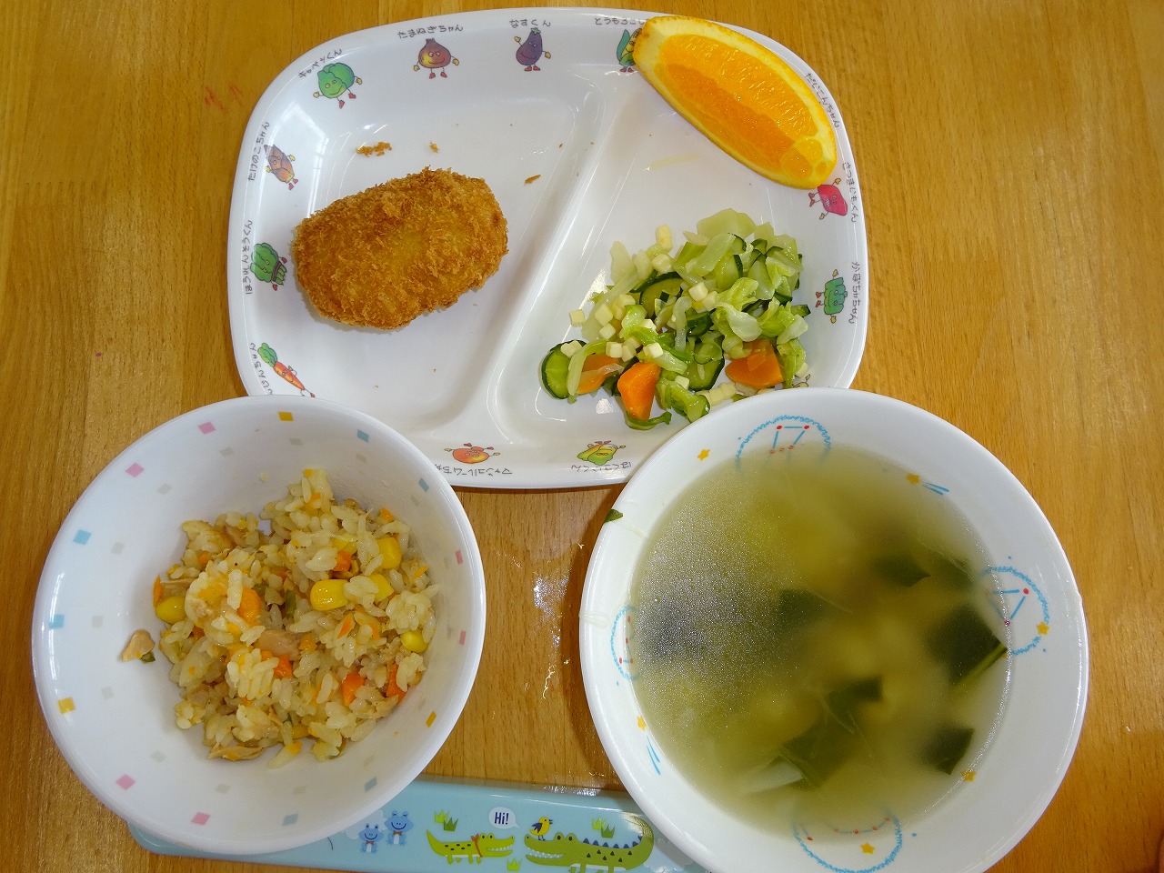 5月16日(月)給食 ・ツナチャーハン(米・ツナ・玉ねぎ・にんじん・ピーマン) ・豚肉コロッケ ・チーズサラダ(チーズ・キャベツ・きゅうり・にんじん) ・コンソメスープ(マカロニ・玉ねぎ・しめじ・こまつな) ・オレンジ おやつは、牛乳とせんべい + いちご 🍓