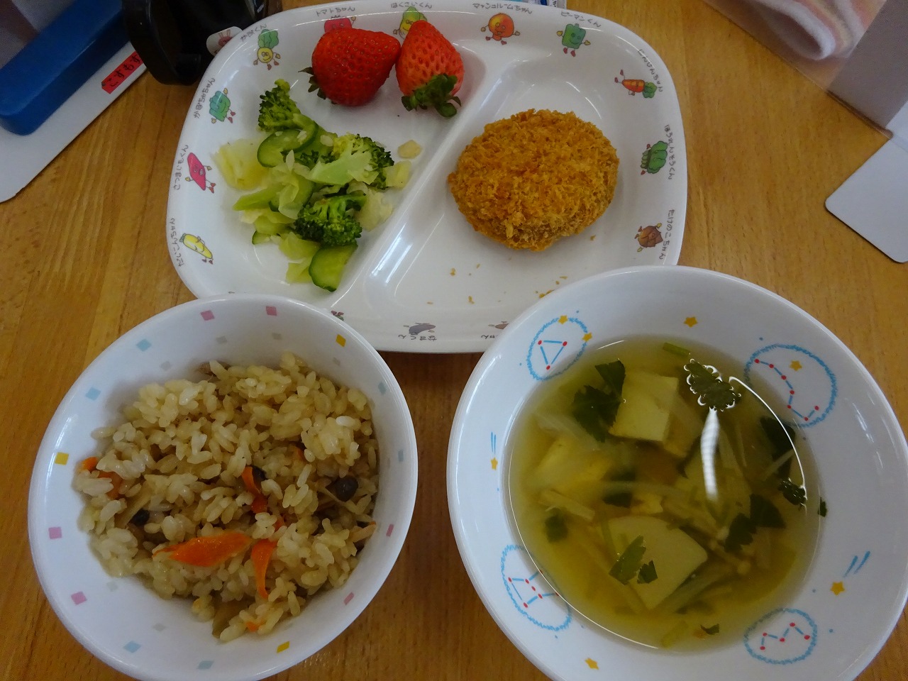 1月25日(火) 給食 ・味ごはん(米・ツナ・しめじ・にんじん) ・メンチカツ ・チップスサラダ(キャベツ・ブロッコリー・きゅうり・にんじん・ポテトチップス) ・すまし汁(豆腐・かまぼこ・えのきたけ・玉ねぎ・みつば) ・いちご