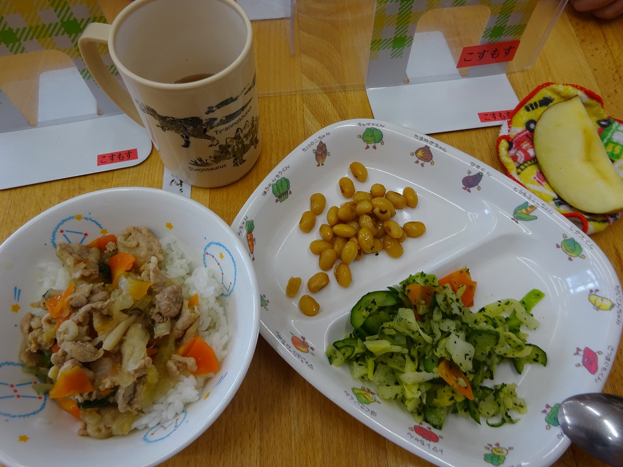1月26日(水)給食 ・豚どんぶり(米・豚肉・玉ねぎ・にんじん・しめじ・こまつな) ・キャベツのかおりあえ(キャベツ・きゅうり・にんじん・かおり) ・大豆の甘煮 ・りんご