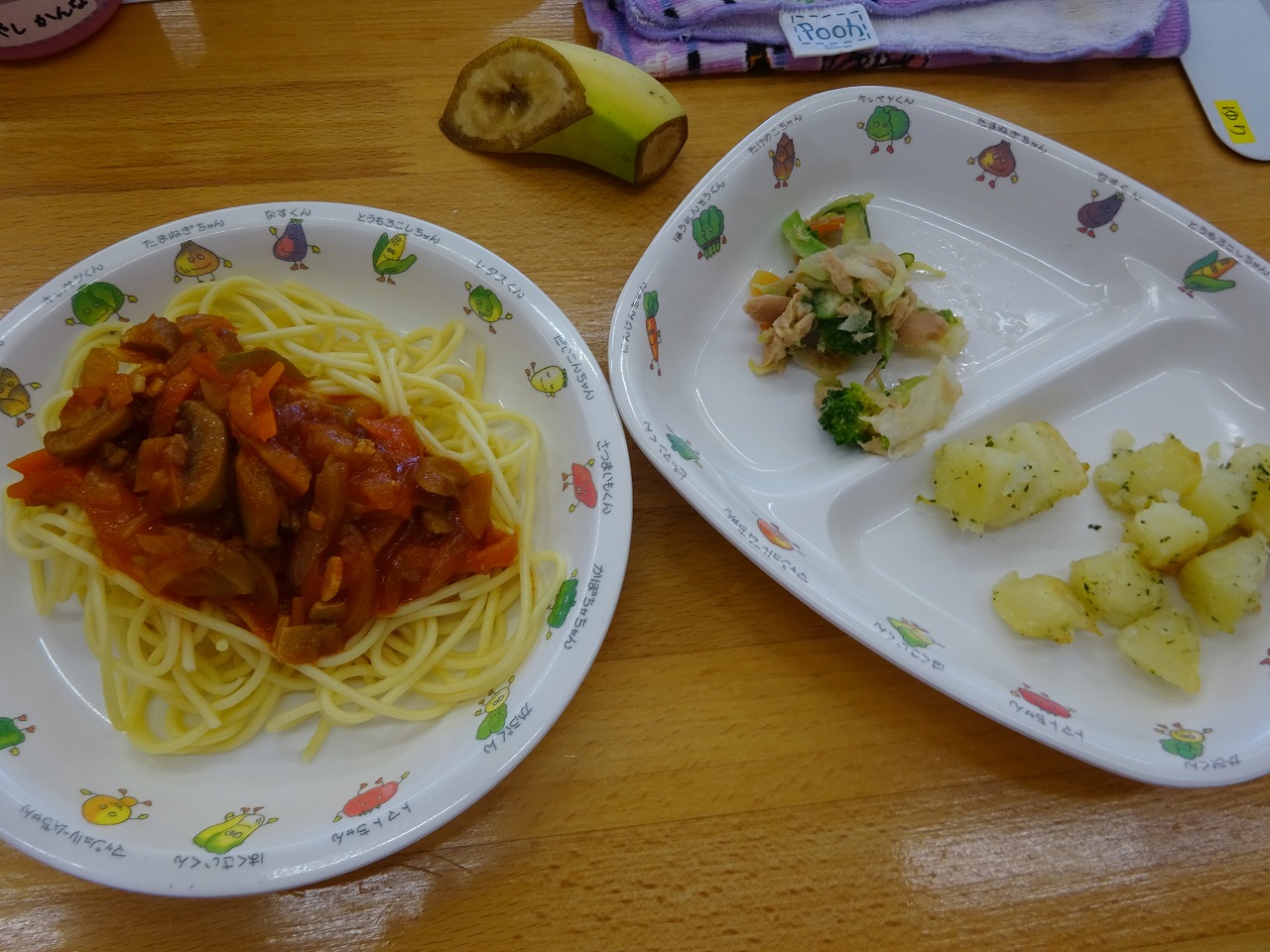 10月26日(火)給食 ・ナポリタンスパゲティ(パスタ・ベーコン・玉ねぎ・にんじん・ピーマンケチャップ) ・じゃが芋のオーブン焼き ・ツナサラダ(ブロッコリー・ツナ・キャベツ・きゅうり・にんじん) ・バナナ