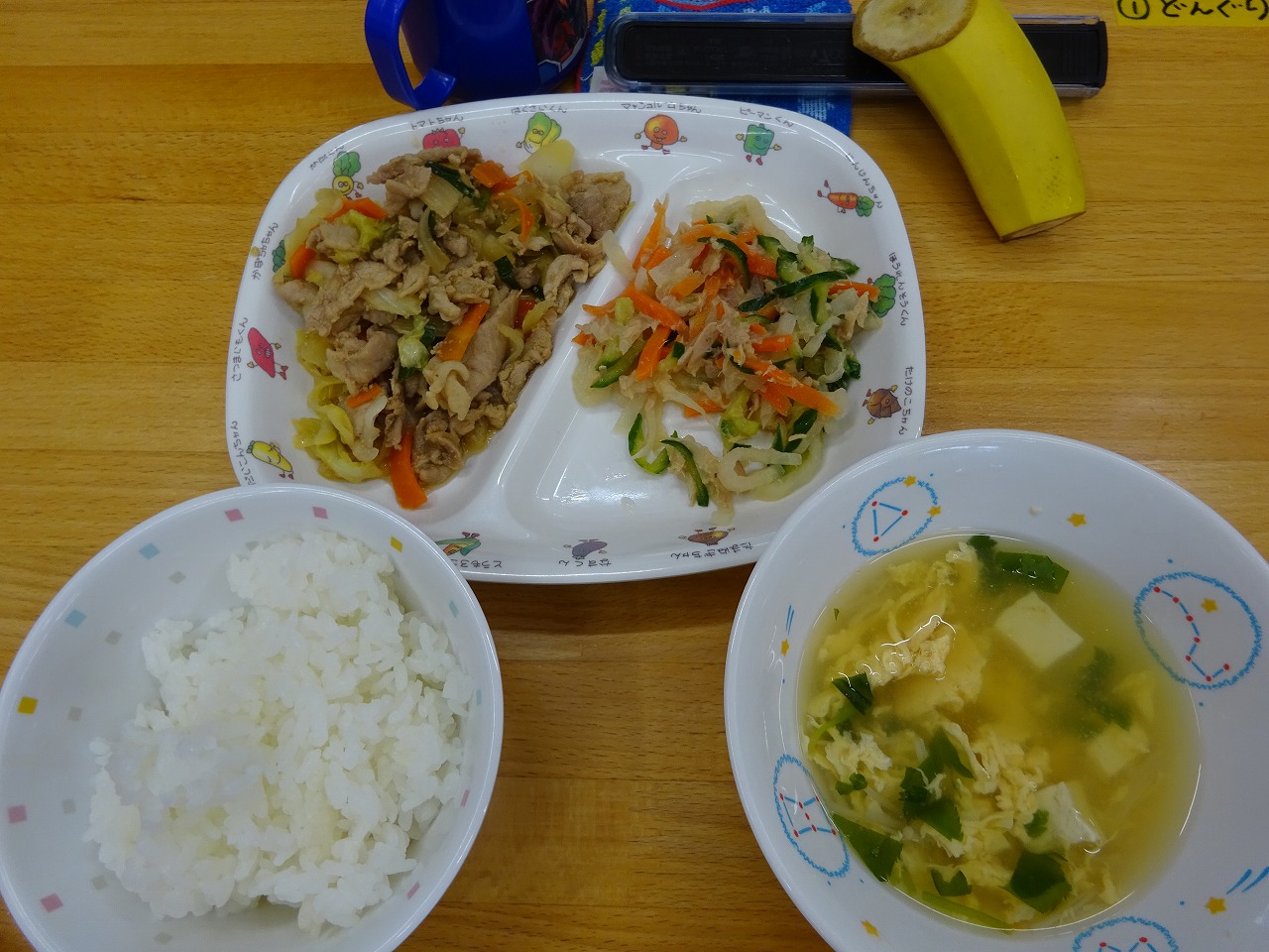 10月1日(金)給食 ・ごはん ・豚肉のみそ炒め(豚肉・キャベツ・玉ねぎ・にら・にんじん) ・だいこんサラダ(だいこん・きゅうり・にんじん・ツナ) ・かきたま汁(豆腐・かまぼこ・えのきたけ・卵・みつば) ・バナナ