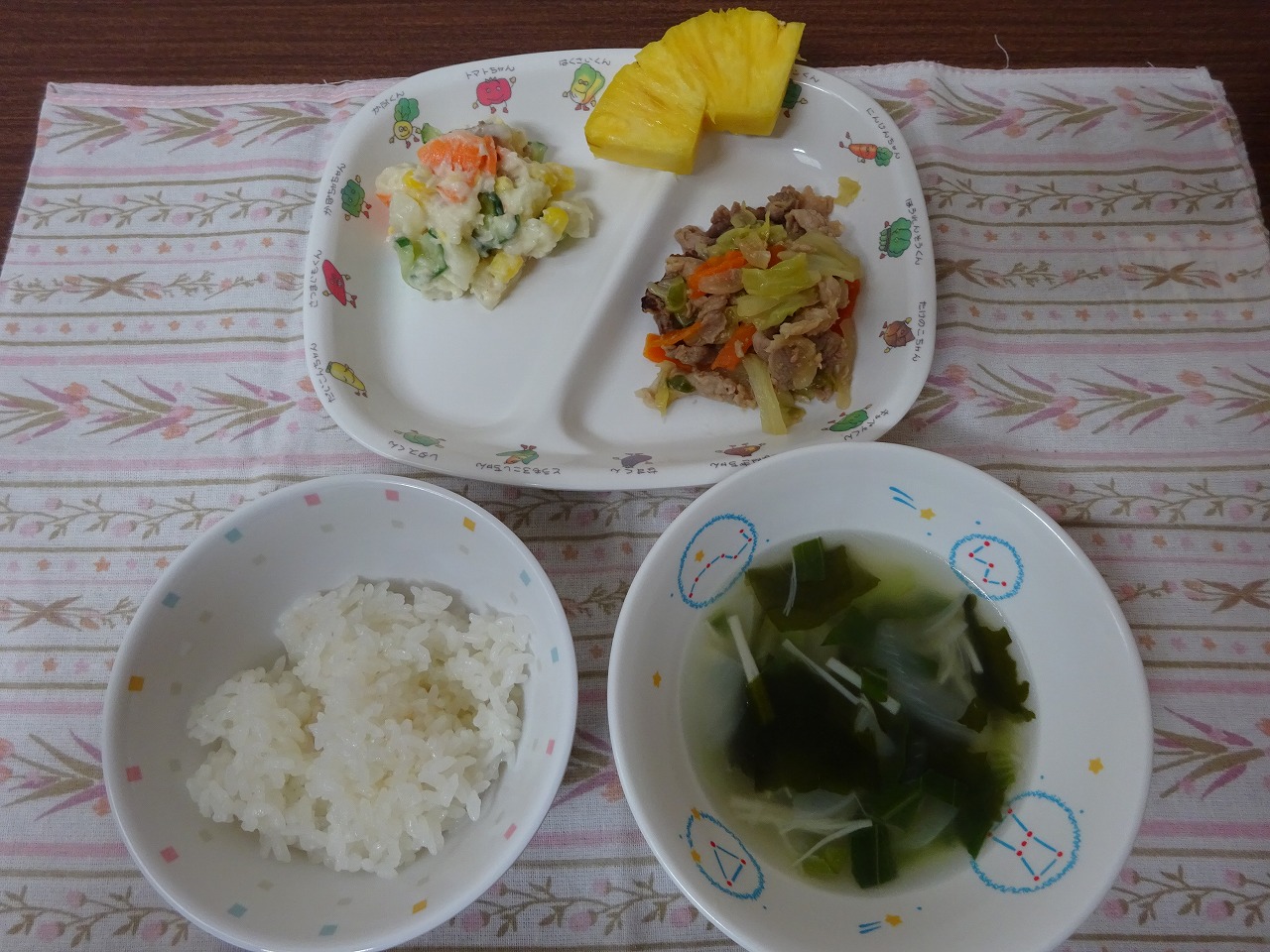 6月27日(木)給食:下呂市お米の日 ・ごはん(ゆきむすび) ・ホイコーロー ・ポテトサラダ ・中華スープ ・パイナップル