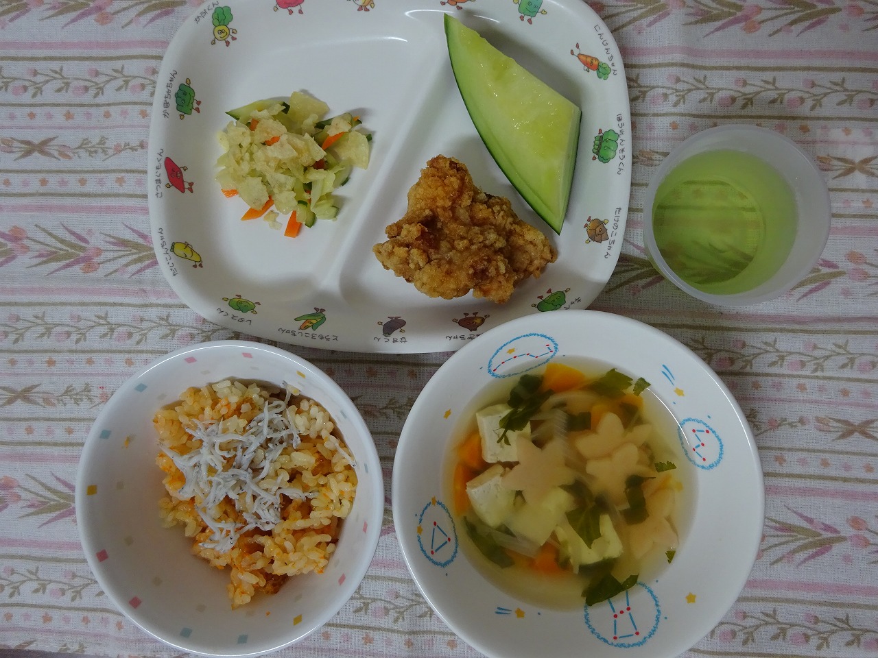 6月28日(金)給食:誕生会メニュー ・夕焼けごはん ・鶏肉の唐揚げ ・チップスサラダ ・すまし汁 ・メロン(※今月の誕生児のみゼリーがつきます)
