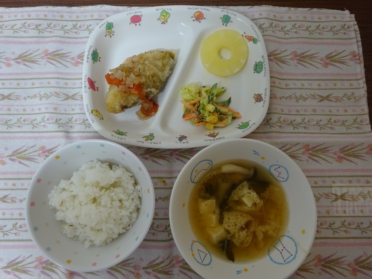 7月2日(火)給食 ・ごはん ・さわらのエスカベッシュ ・人参サラダ ・みそ汁 ・ベビーパイン