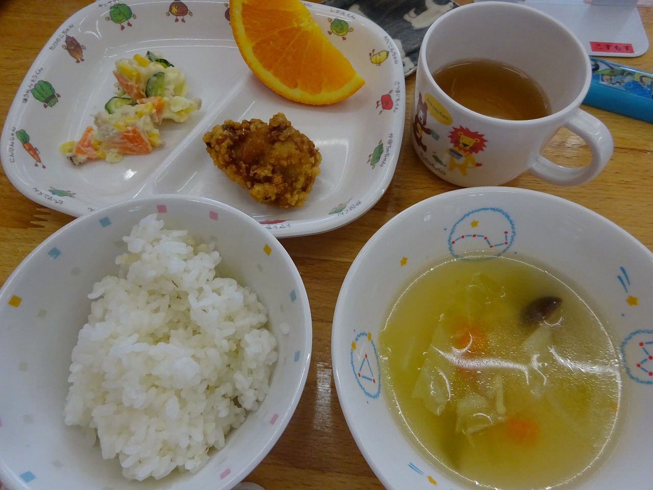 4月30日(金)給食 ・ごはん ・鶏肉の唐揚げ ・ポテトサラダ(じゃがいも・きゅうり・にんじん・ハム・コーン・マヨドレ) ・ABCスープ(マカロニ・キャベツ・玉ねぎ・にんじん・しめじ) ・オレンジ