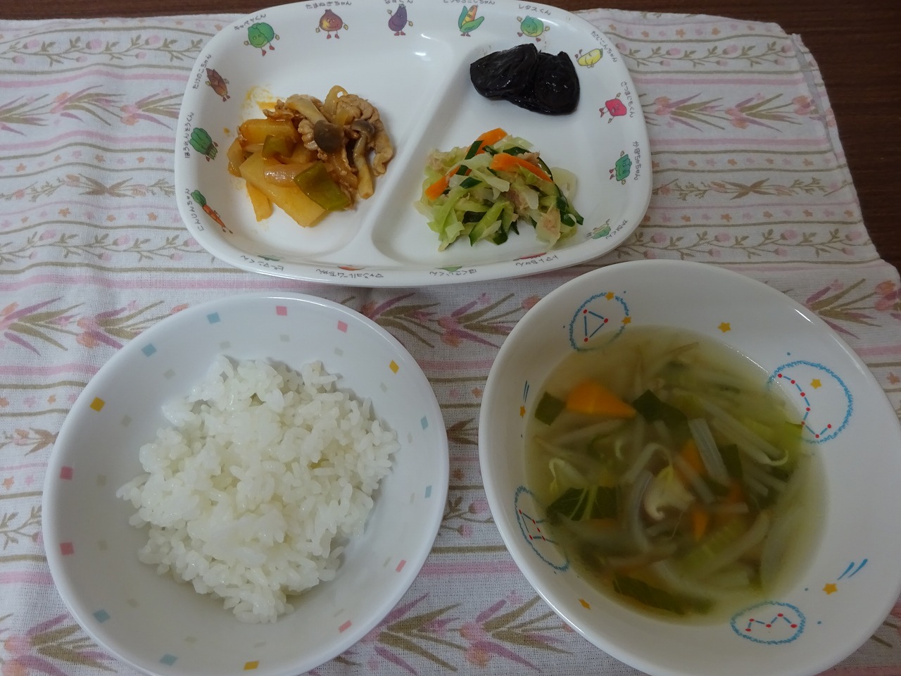 6月21日(金)給食 ・ごはん ・ポークケチャップ ・キャベツサラダ ・コンソメスープ ・プルーン