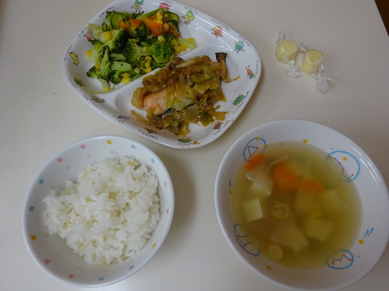 12月23日(水)給食 ・ごはん ・鮭のちゃんちゃん焼き(鮭・玉ねぎ・キャベツ・しめじ・ねぎ) ・フレンチサラダ(ブロッコリー・きゅうり・コーン・にんじん) ・五目汁(鶏肉・豆腐・だいこん・にんじん・ねぎ) ・チーズ