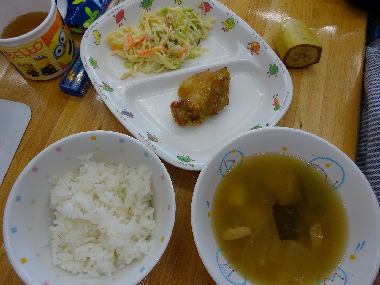 12月16日(水)給食 ・ごはん ・鶏肉のカレー焼き(鶏肉・はつみつ・にんにく・カレー粉) ・スパゲティサラダ(スパサラ・ツナ・きゅうり・にんじん・キャベツ・マヨドレ) ・みそ汁(豆腐・油揚げ・玉ねぎ・なめこ・わかめ・みそ) ・バナナ