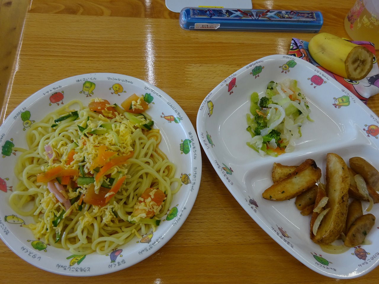 8月26日(水)給食 ・冷やし中華(中華麺・ハム・卵・トマト・きゅうり・にんじん) ・ブロッコリーサラダ(ブロッコリー・キャベツ・にんじん) ・ジャーマンポテト(ポテト・ウインナー・玉ねぎ・パセリ) ・バナナ