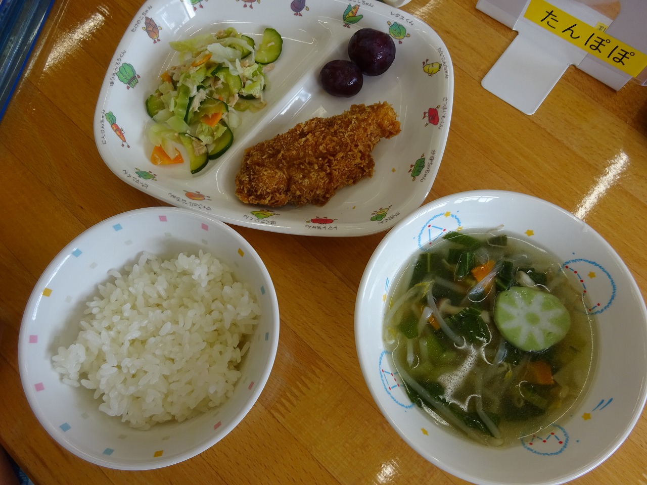8月28日(金)給食 ・ごはん ・ひれカツ(豚肉・卵・パン粉) ・キャベツのサラダ(キャベツ・きゅうり・にんじん・ツナ) ・コンソメスープ(玉ねぎ・にんじん・しめじ・もやし・チンゲン菜・かまぼこ) ・きょほう