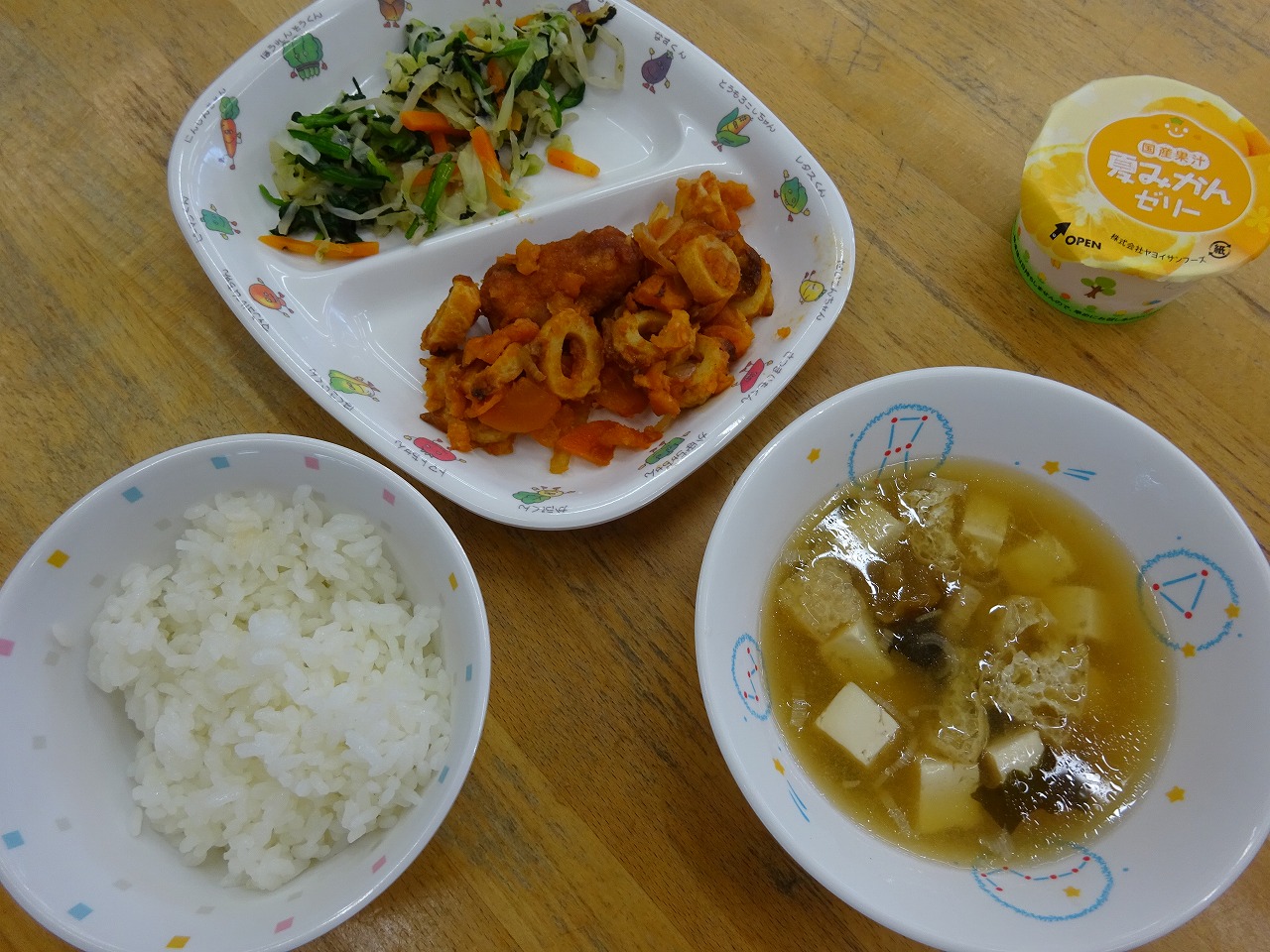 7月27日(月)給食 ・ごはん ・かしわのノルウェー煮(鶏肉・ちくわ・にんじん・玉ねぎ・フライドポテト・グリンピース) ・いそべあえ(ほうれん草・キャベツ・にんじん・もやし・きざみのり) ・みそ汁(豆腐・油揚げ・なめこ・ねぎ・みそ) ・夏みかんゼリー