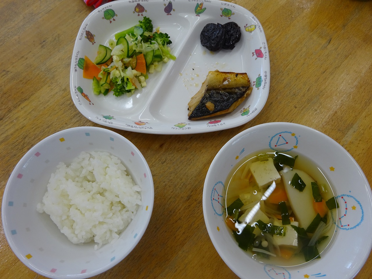 7月28日(火) 給食 ・ごはん ・さばの照り焼き ・チーズサラダ(チーズ・キャベツ・きゅうり・にんじん・ブロッコリー) ・すまし汁(豆腐・えのきたけ・こまつな・玉ねぎ・にんじん) ・プルーン